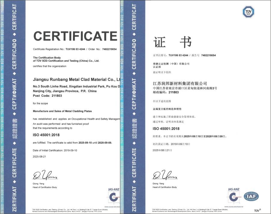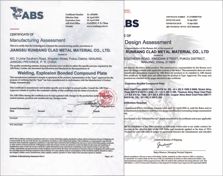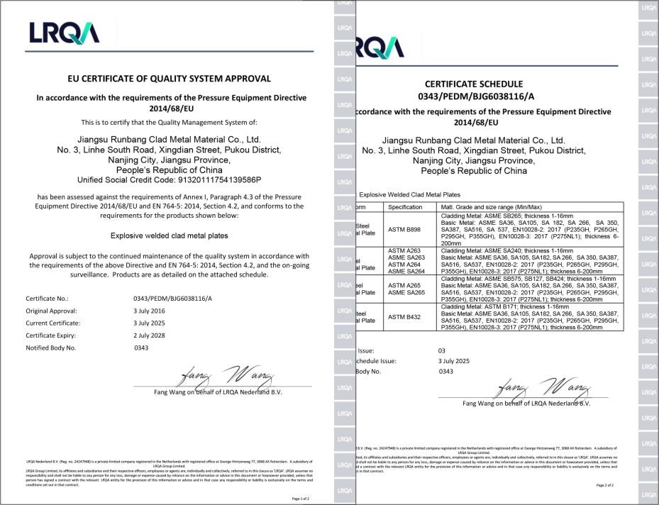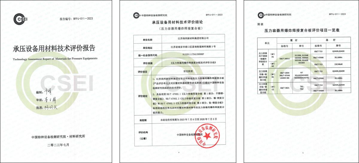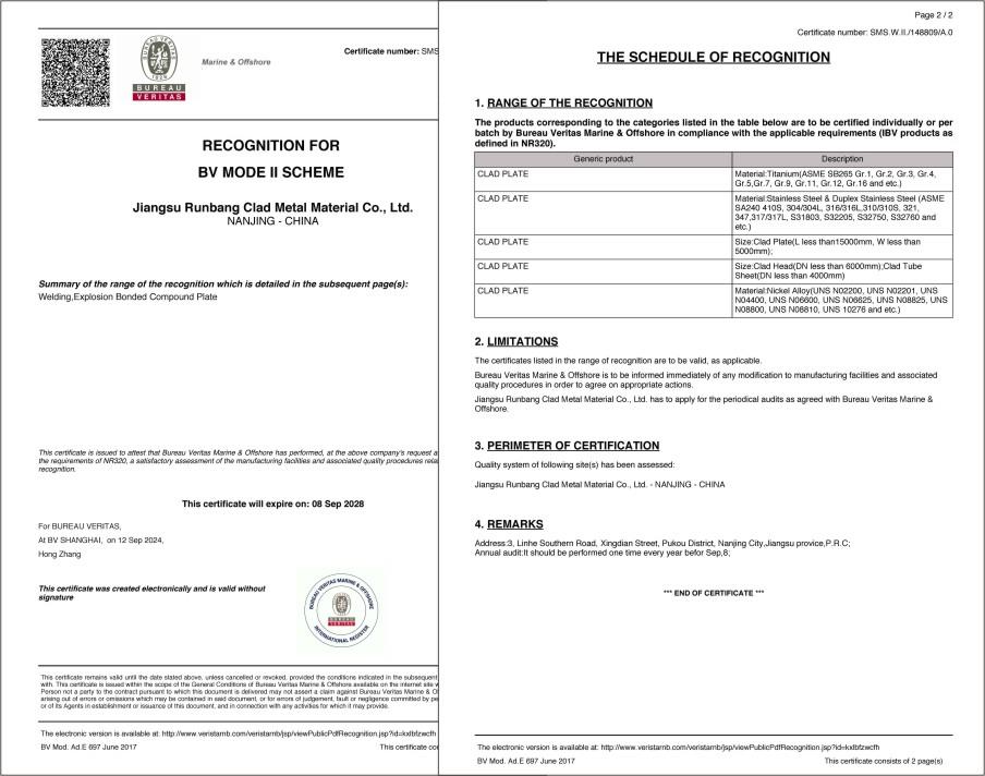 | 鄧白氏證書 | BV | 壓力容器用爆炸復(fù)合鋼板產(chǎn)品安全注冊(cè)證書 | |